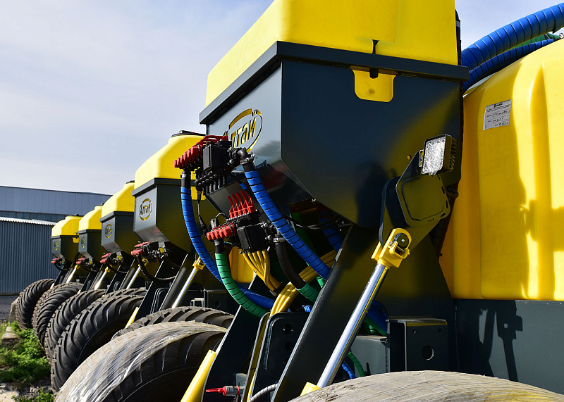 К трактору агрегатируется прицепная емкость, а к ней – посевной комплекс. На сеялки устанавливается система трубопроводов, к каждому сошнику подводится трубка из нержавеющей стали с клапаном. Это позволяет вносить удобрения как в один ряд с семенами, так и в междурядья. - Трактор – ЖКУ Алтай – Почвообрабатывающая техника
